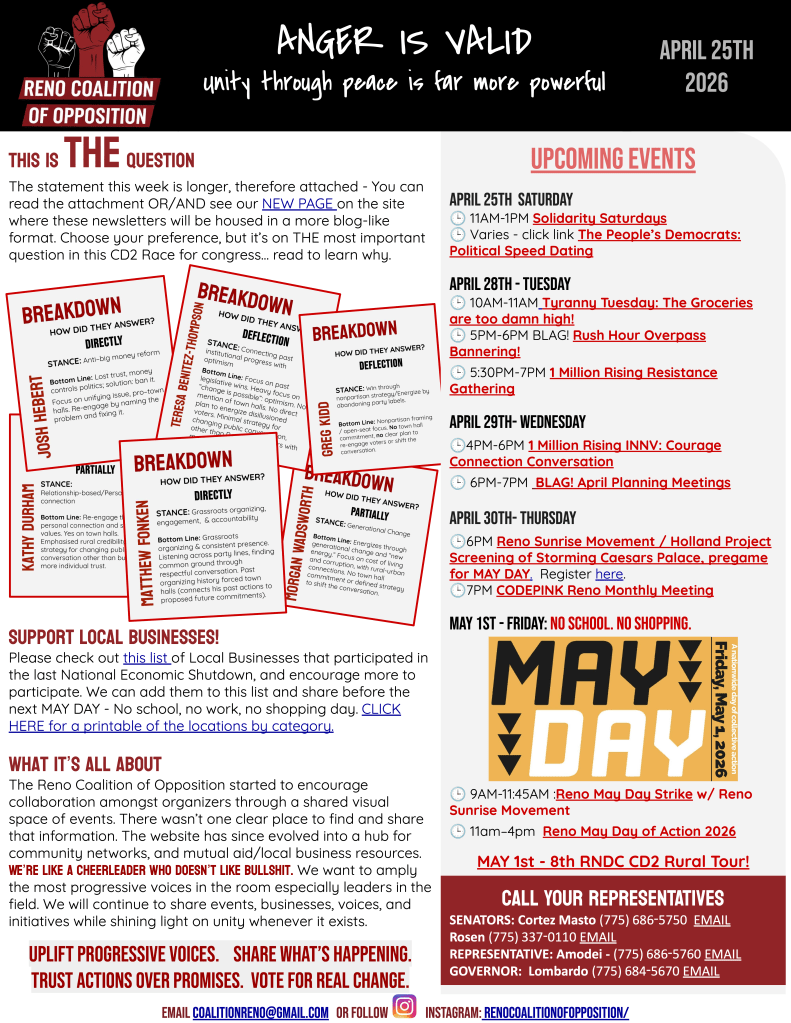 Given the RCO’s motto is Anger is Valid, but UNITY through peace is far more powerful, when we hear “We must be listening to all voices across this district. Pushing kindly, whenever someone says something aggressive to you, don’t get easily offended. Listen, and we listen to the frustration, we find the common pathways,” we take notice! It resonates deeply, and that’s how you build trust from the Truckee River valley, to the high desert basins, to the Northern mountains. Please read a full analysis of each candidate’s response, and the FULL, UNEDITED VIDEO of the corresponding Q&A session on our YouTube to assess for yourself. AND follow on instagram, because more are coming.